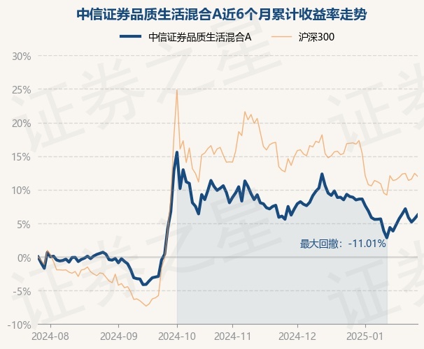 本站消息,1月27日,中信证券品质生活混合A最新单位净值为0.6127元,累计净值为3.4173元,较前一交易日上涨0.54%。历史数据显示该基金近1个月下跌2.06%,近3个月下跌3.33%,近6个月上涨6.24%,近1年上涨6.32%。该基金近6个月的累计收益率走势如下图: